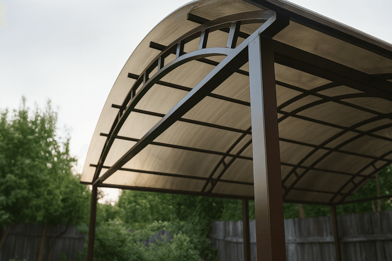Изготовить навес из профильной трубы можно в короткие сроки — технология позволяет точно рассчитать нагрузки и обеспечить надежность конструкции. Такие навесы подходят для небольших участков и больших парковочных зон.